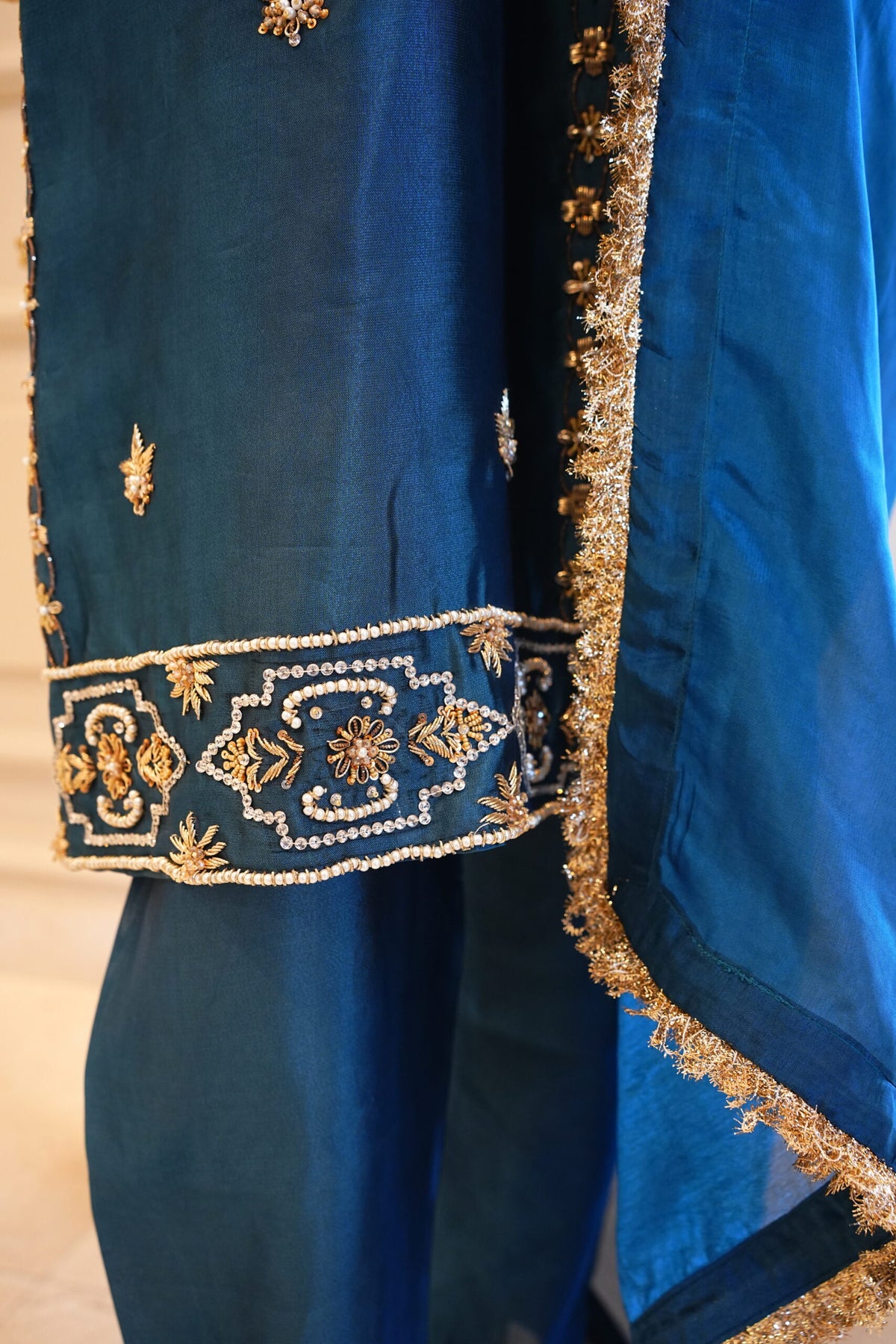 This elegant 3-piece hand-embroidered silk suit is designed with love and traditional craftsmanship. The Shisha Silk kameez has beautiful handmade work, including pul, dapka, sitara, tikkie, and stone detailing, giving it a rich and classic look.