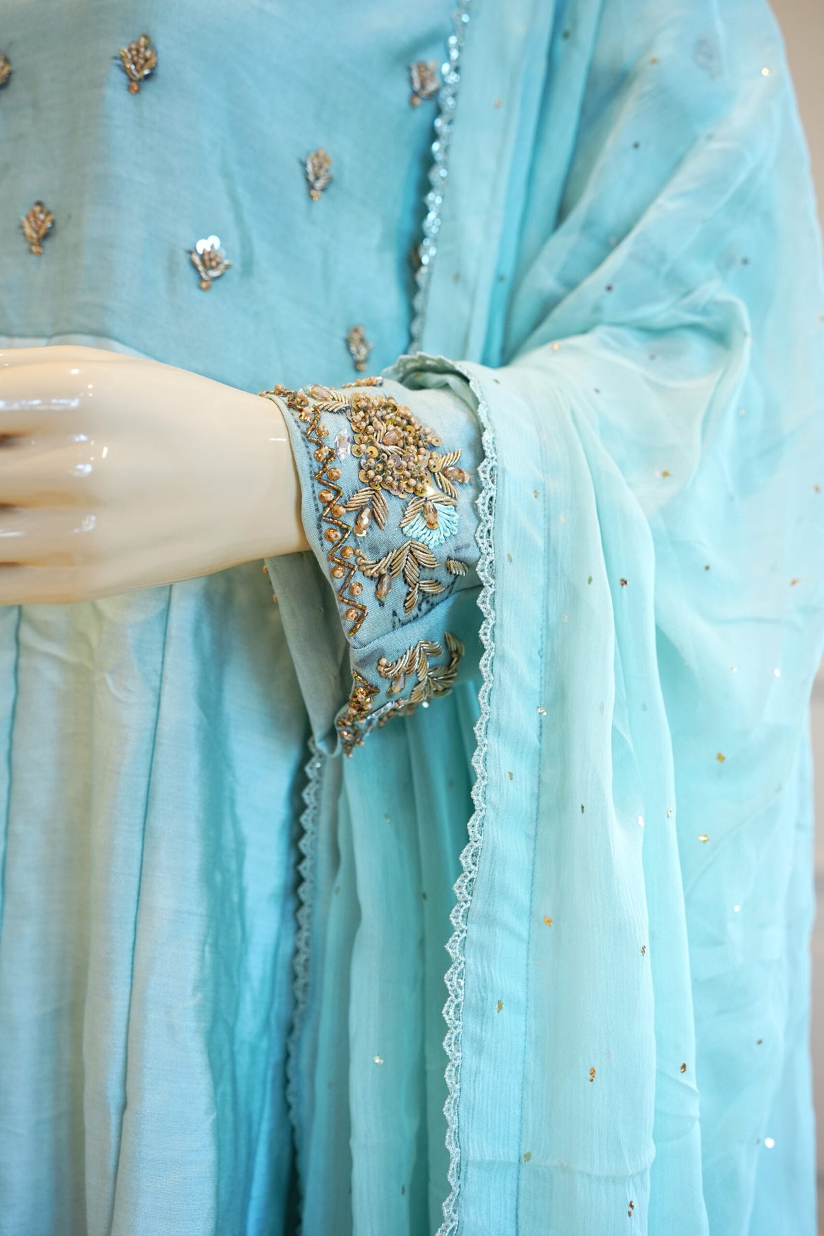 This Ice Green Hand-Embellished Khadi Silk Suit is a true statement of elegance and craftsmanship.