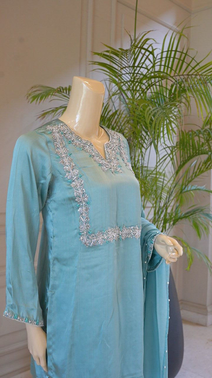 The short shirt made from pure Shamos Silk is intricately handworked with dapka, crystal, and resham embroidery, adding a graceful shimmer and texture. It is paired with a straight Shamos Silk trouser and a lightweight shafoon dupatta, offering an elegant drape and soft flow.