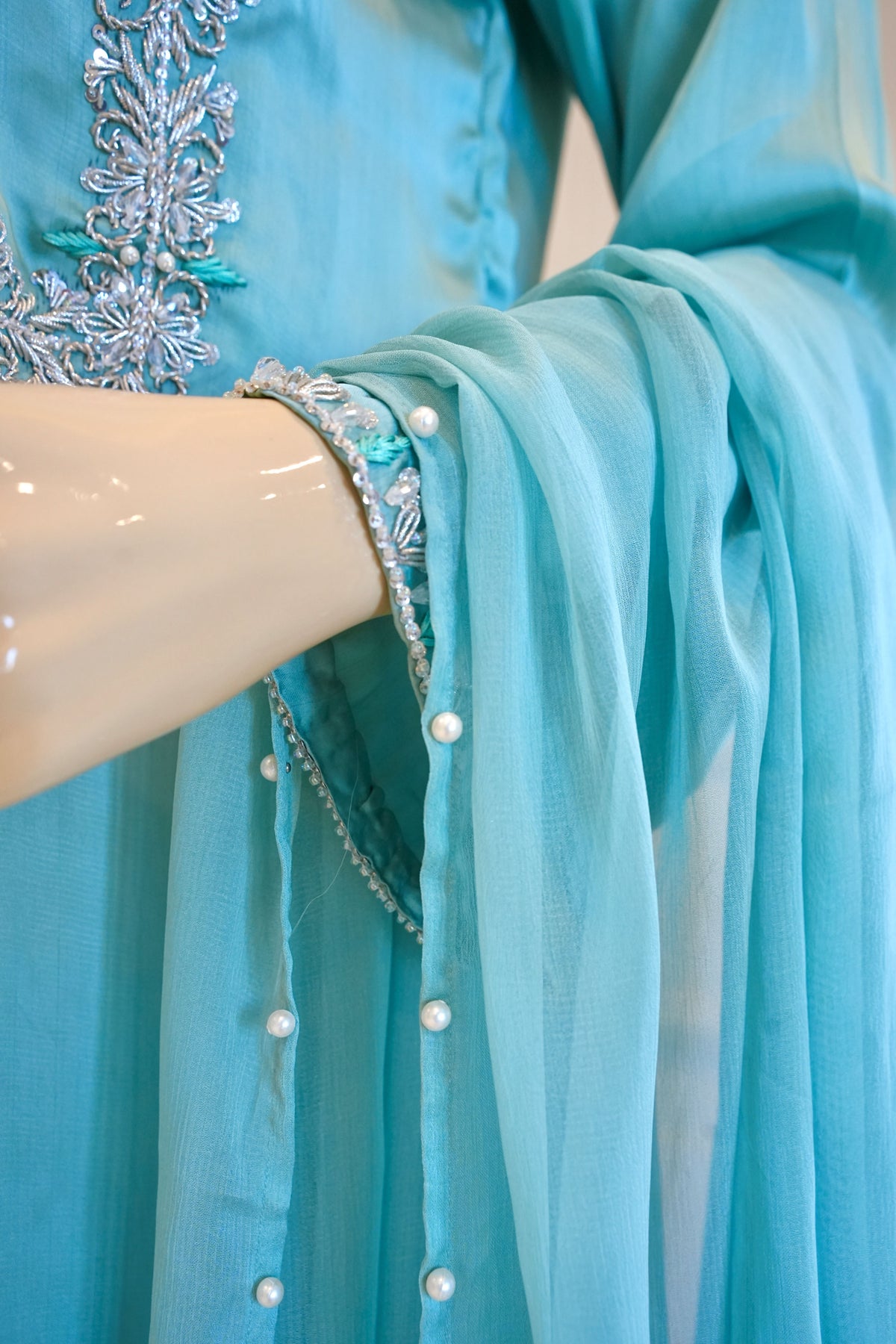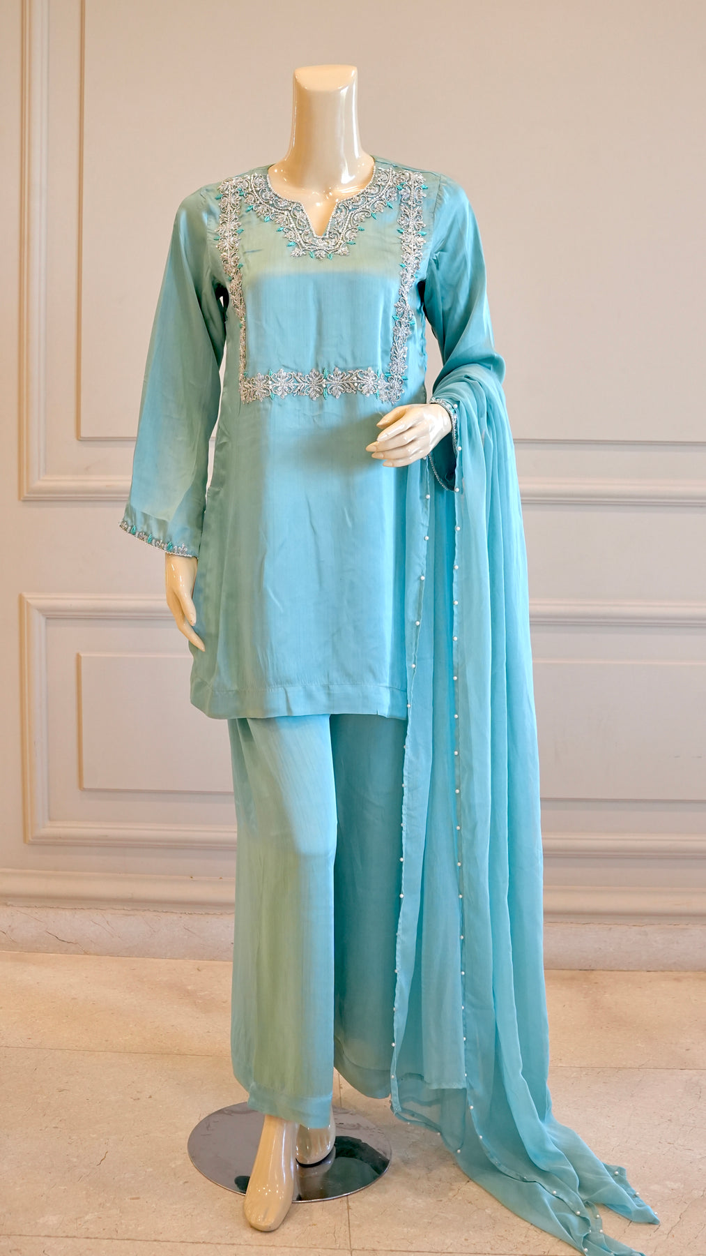 This Light Blue Hand-Embellished Shamos Silk Suit combines luxurious fabric with fine craftsmanship to create a timeless festive look.