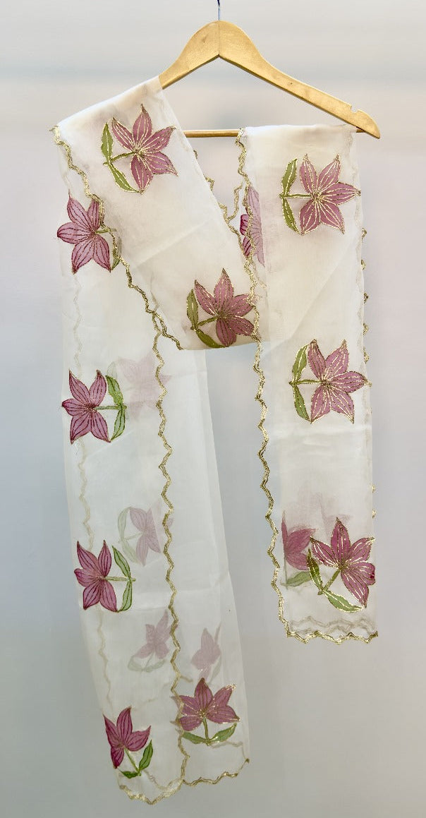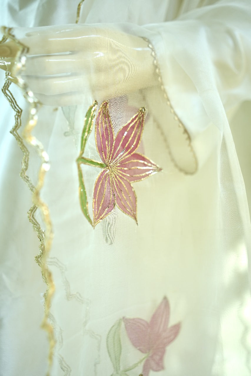 Made on premium Pure Shisha Silk, the long shirt features soft and artistic hand-painted detailing with Pita work, giving a refined and graceful finish. The straight trouser adds sleek sophistication, while the Organza dupatta with lace edges completes the look with a gentle, feminine touch.