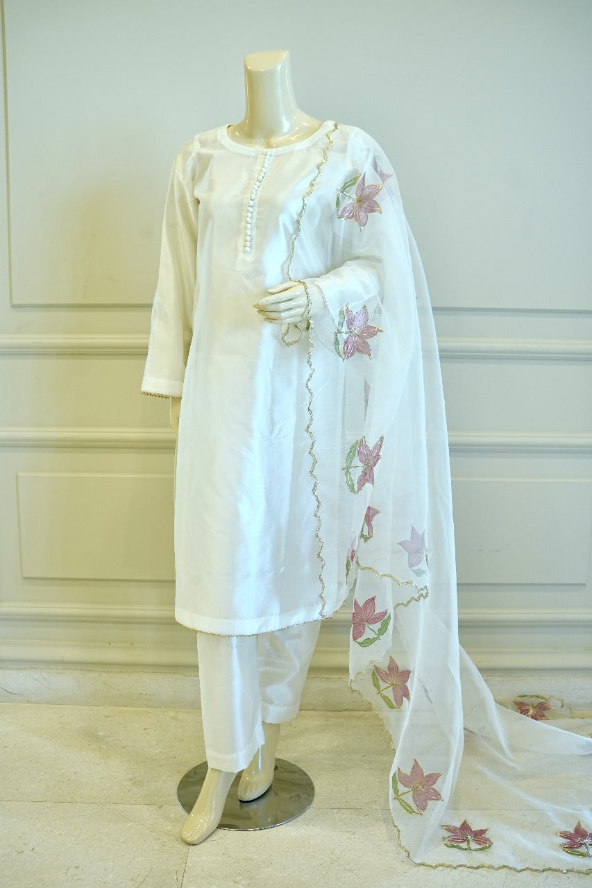 Pure elegance meets artisan beauty in this 3-piece hand-painted white silk suit.